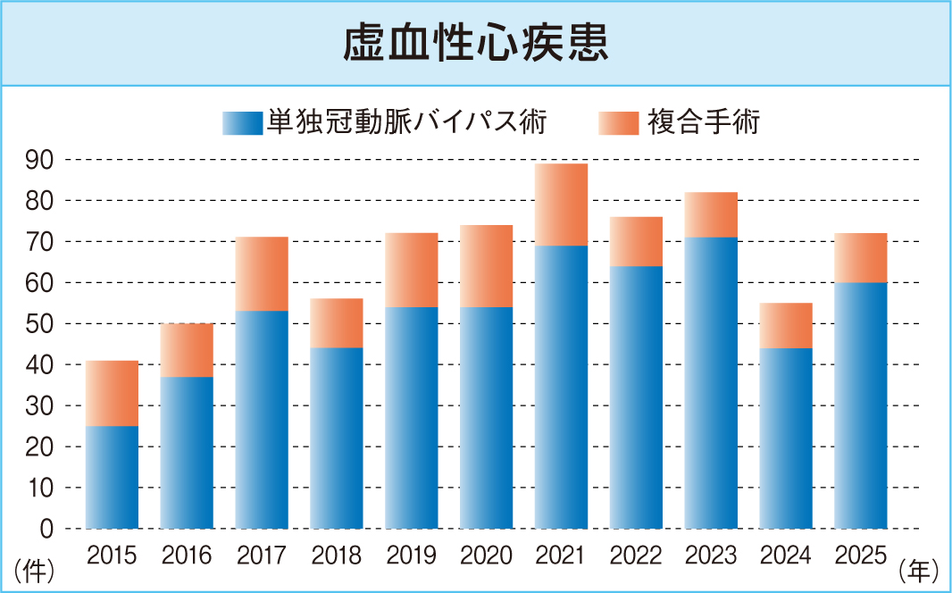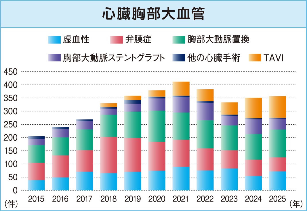 - 開心術 約2800例(大血管手術:約600例、虚血性心疾患:約1000例、弁膜症:約1200例、MICS手術:約220例)