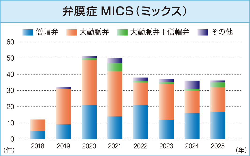 従来の胸部正中を切開するアプローチに比べ、切開創が小さくめだたない、出血や感染が少ないなどの利点があり、最近の弁膜症手術の多くは低侵襲心臓手術(MICS)の適応となります。