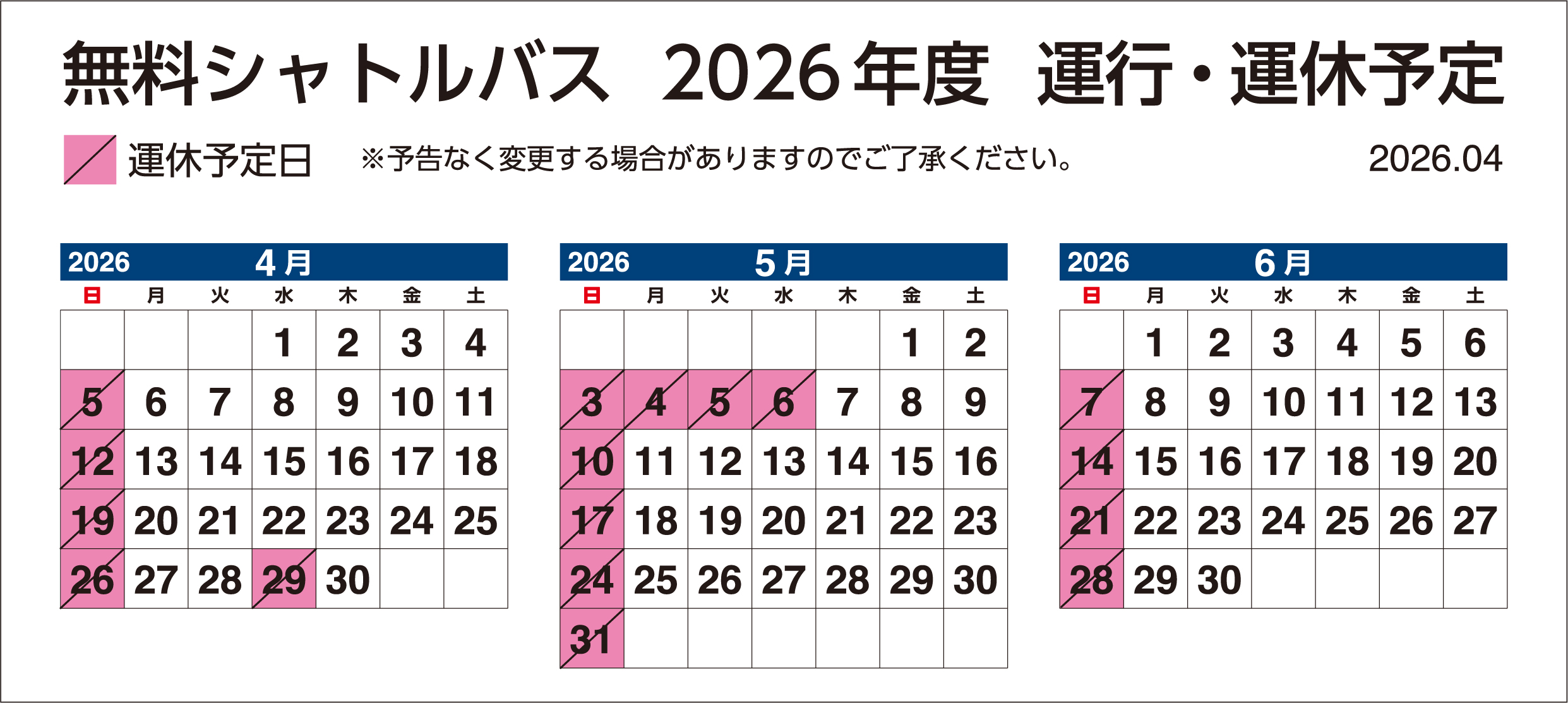 ホーム お知らせ お知らせ お知らせ一覧 【無料シャトルバス 2026年 4・5・6月の運休日】 お知らせ2026-03-03 【2026年 4月・5月・6月】無料シャトルバスの運休日は下記の予定です。 ご理解の程よろしくお願いいたします。 一覧に戻る