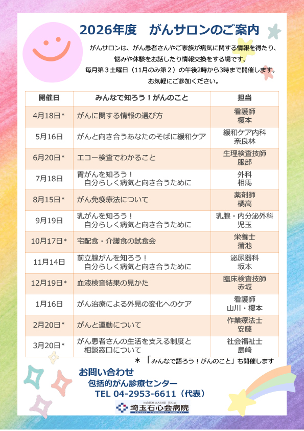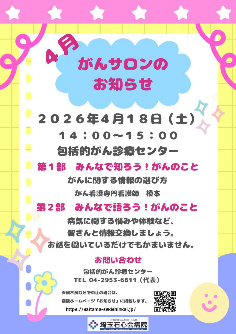 毎月開催しております、がんサポート委員会主催のがんサロンのお知らせです。