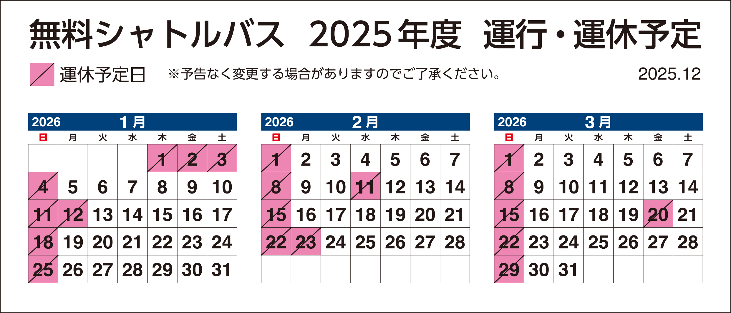 ホーム お知らせ お知らせ お知らせ一覧 【無料シャトルバス 2026年 1・2・3月の運休日】 お知らせ2025-12-04 【2026年 1月・2月・3月】無料シャトルバスの運休日は下記の予定です。 ご理解の程よろしくお願いいたします。 一覧に戻る
